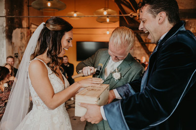 Bram en Serena hadden ervoor gekozen geen ringen uit te wisselen tijdens de ceremonie, daarom hebben we voor een alternatief gekozen. Na het ja-woord hebben Bram en Serena hun geloftes opgesloten in een wijnkistje en ceremonieel dicht getimmerd. Over een jaar zullen zij op hun trouwdag hun liefde vieren door het kistje te openen. Onder het genot van een heerlijk glas wijn zullen zij hun geloftes voor elkaar teruglezen. Het dicht timmeren van het kistje zorgde voor hilarische taferelen, vanwege de angst voor het op elkaars vingers te timmeren.